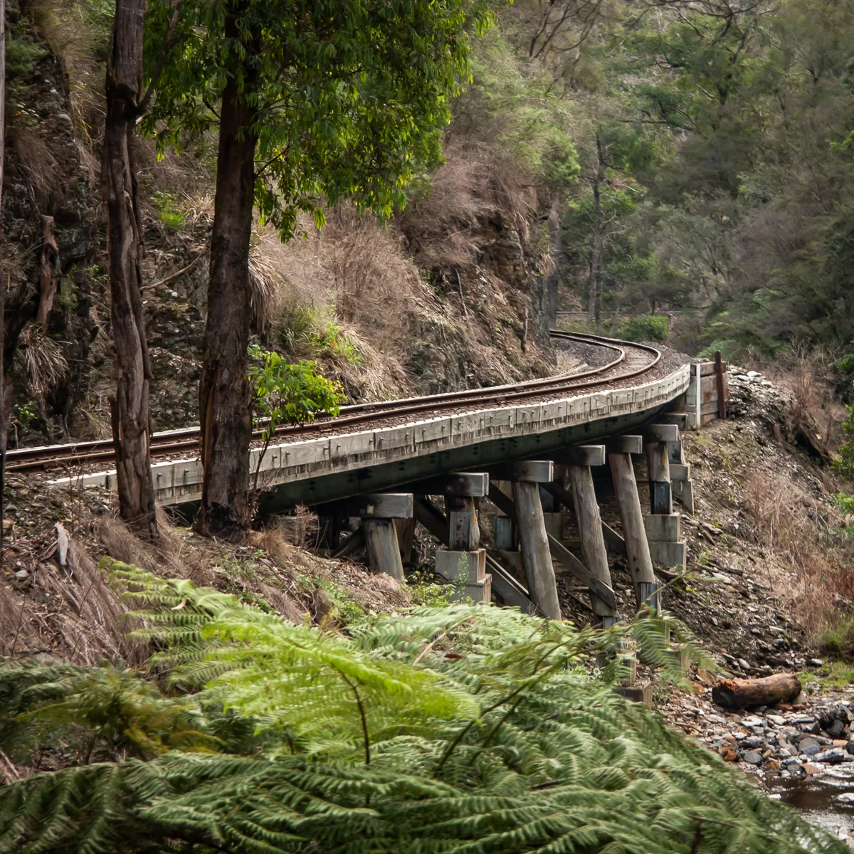 The Walhalla Goldfields Railway is a restored narrow-gauge line that runs 4 kilometres from the Thomson River station to Walhalla township through the forested gorge. The railway uses a replica of the original rolling stock and crosses several restored timber trestle bridges. It operates on weekends and public holidays and is one of the most scenic heritage rail experiences in Victoria.